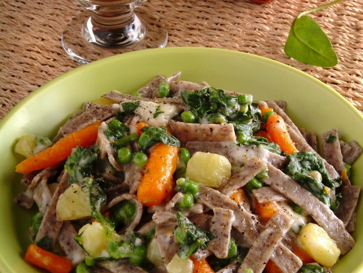 Buchweizen Pasta, Kartoffeln, Rüebli, Wirz, Bohnen, Käse, Knoblauch-Salbeibutter